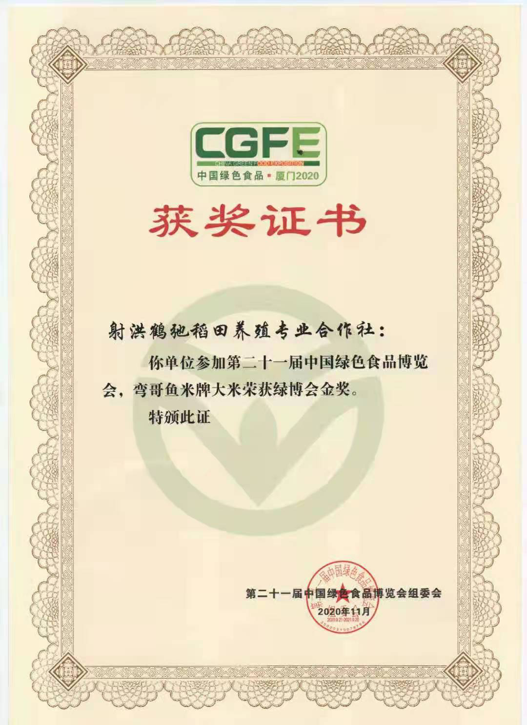 在绿色展区众多展品中,射洪鹤驰稻田养殖专业合作社的绿色产品“弯哥鱼米”牌大米获本届绿博会金奖。