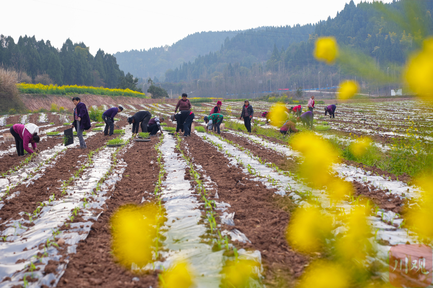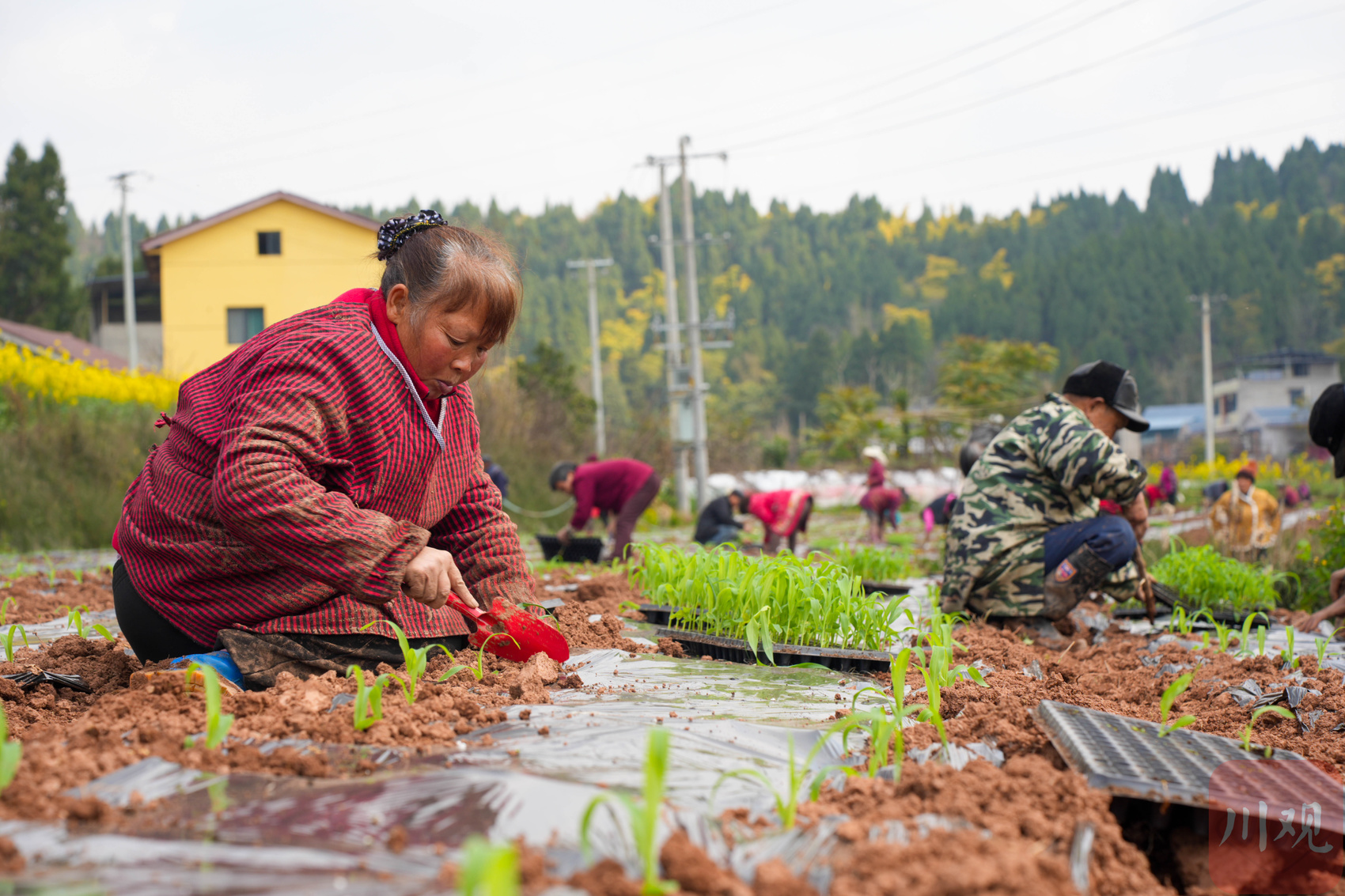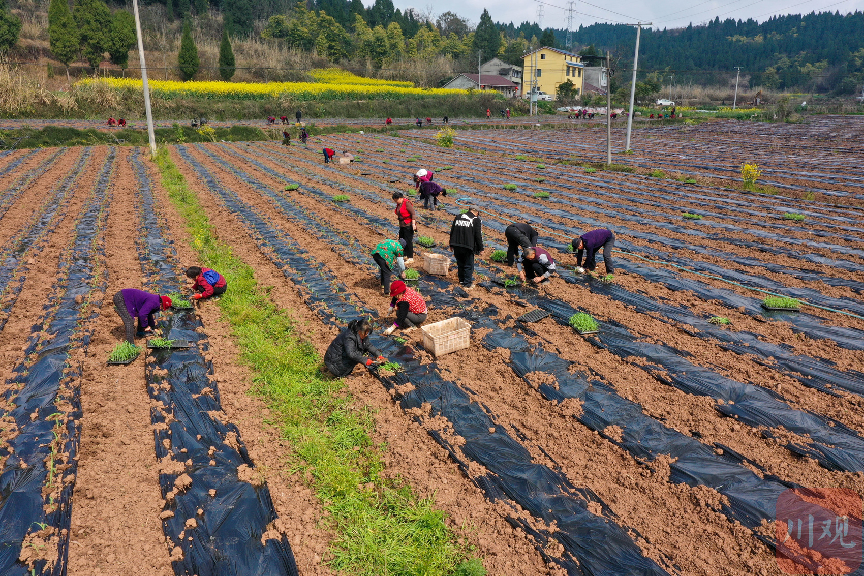 春种一粒粟,秋收万颗子。当下,正值春耕时节,记者走进遂宁市安居区会龙镇白羊村华平强盛蔬菜种植基地,蓝天白云下,田地里新添的几抹绿色格外亮眼,数十名村民正忙着插苗引水,在田间地头来回奔走。