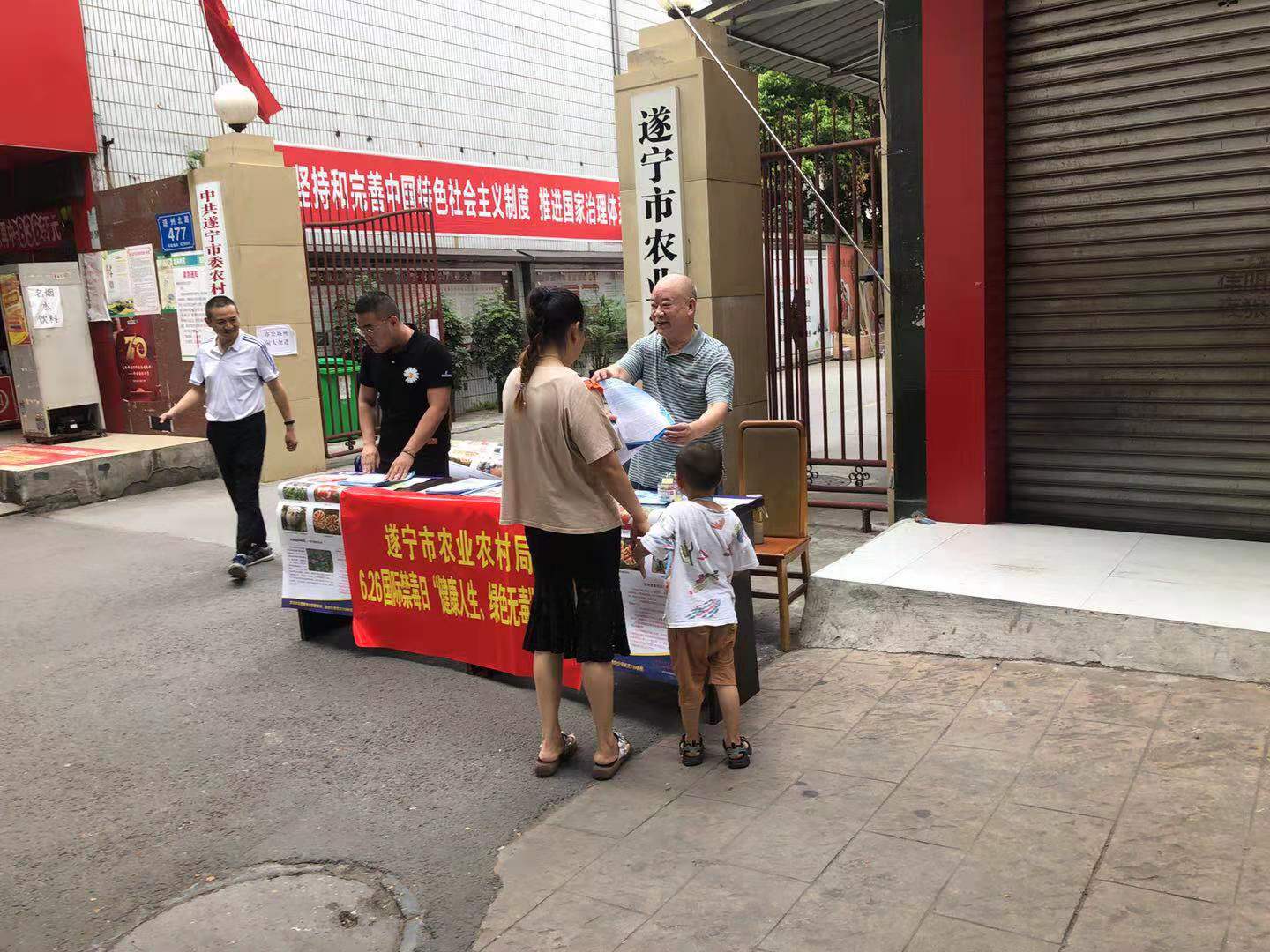 6月26日上午,按照市禁毒委的统一安排部署,市农业农村局以"健康人生、绿色无毒"为主题,在遂州北路477号路口处开展禁毒宣传活动,着力提高广大人民群众对毒品危害的认识。