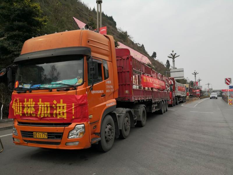 为助力湖北省仙桃市抗击新冠肺炎疫情,"遂宁鲜"农业公用品牌发展协会牵头,遂宁市健坤城商会、力展物流等爱心商协会和20家爱心企业共同发起,筹集萝卜、南瓜、遂宁红薯(蓬溪金薯)、矮晚柚等耐储农产品和消毒液、酒精等物资近百吨,货值70余万元,于2月14日上午10时,从四川遂宁市力展物流配送中心发车运往仙桃市。目前已由仙桃慈善总会接收,并在第一时间分发完毕。