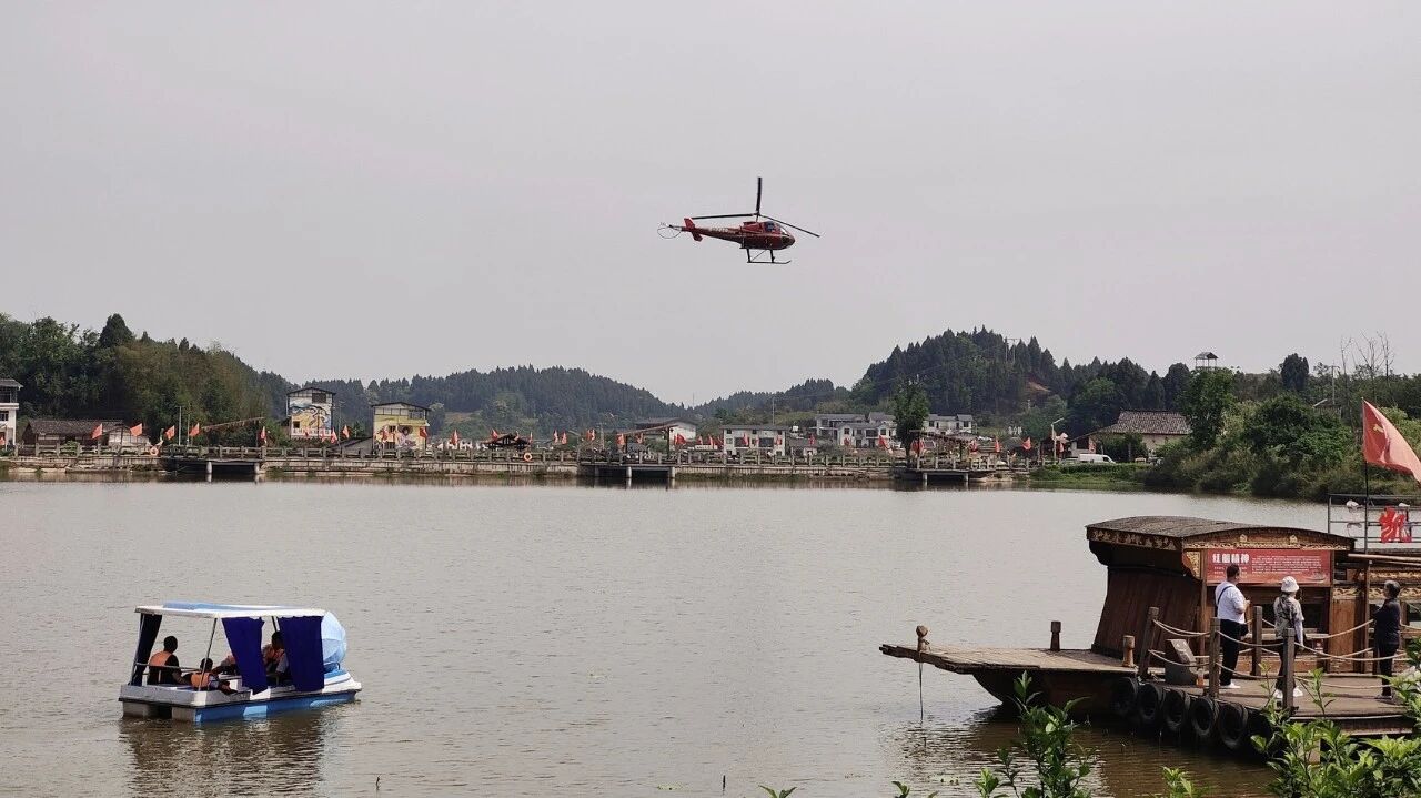 今年春节期间,海龙凯歌农文旅园区“低空旅游”直升机观光旅行正式启动。项目设置了环海龙凯歌8公里、环海龙凯歌至常理镇12公里、环海龙凯歌至遂宁观音湖40公里三条短途、中途、长途路线。活动首日就吸引500余名游客前来体验“在村里坐飞机”。