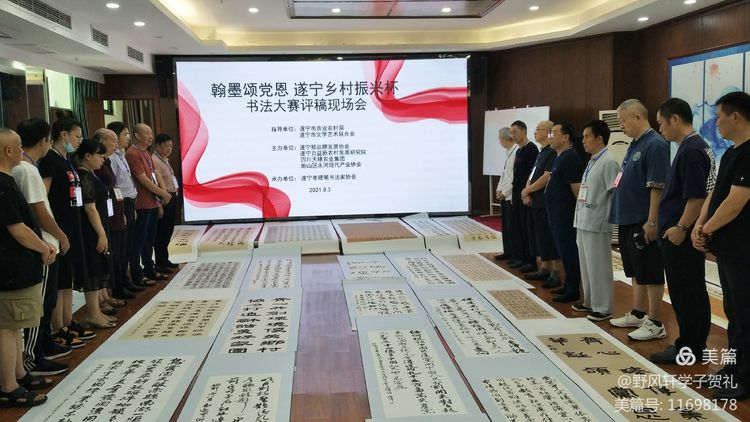 暑去秋来,初秋时节,在遂宁市农业农村局和遂宁市文联的指导下,由遂宁鲜品牌发展协会,遂宁百益新农村发展研究院,四川天穗农业集团,船山区永河现代产业协会共同主办,由遂宁市硬笔书法家协会承办的翰墨颂党恩 . 遂宁乡振兴杯书法大赛评稿现场会在遂宁鲜大酒店隆重举行。参加这次评审会的领导和书法家有: