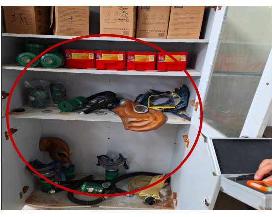 氨制冷机房应急物资柜存在氨滤毒罐失效、防毒面具破损等现象。