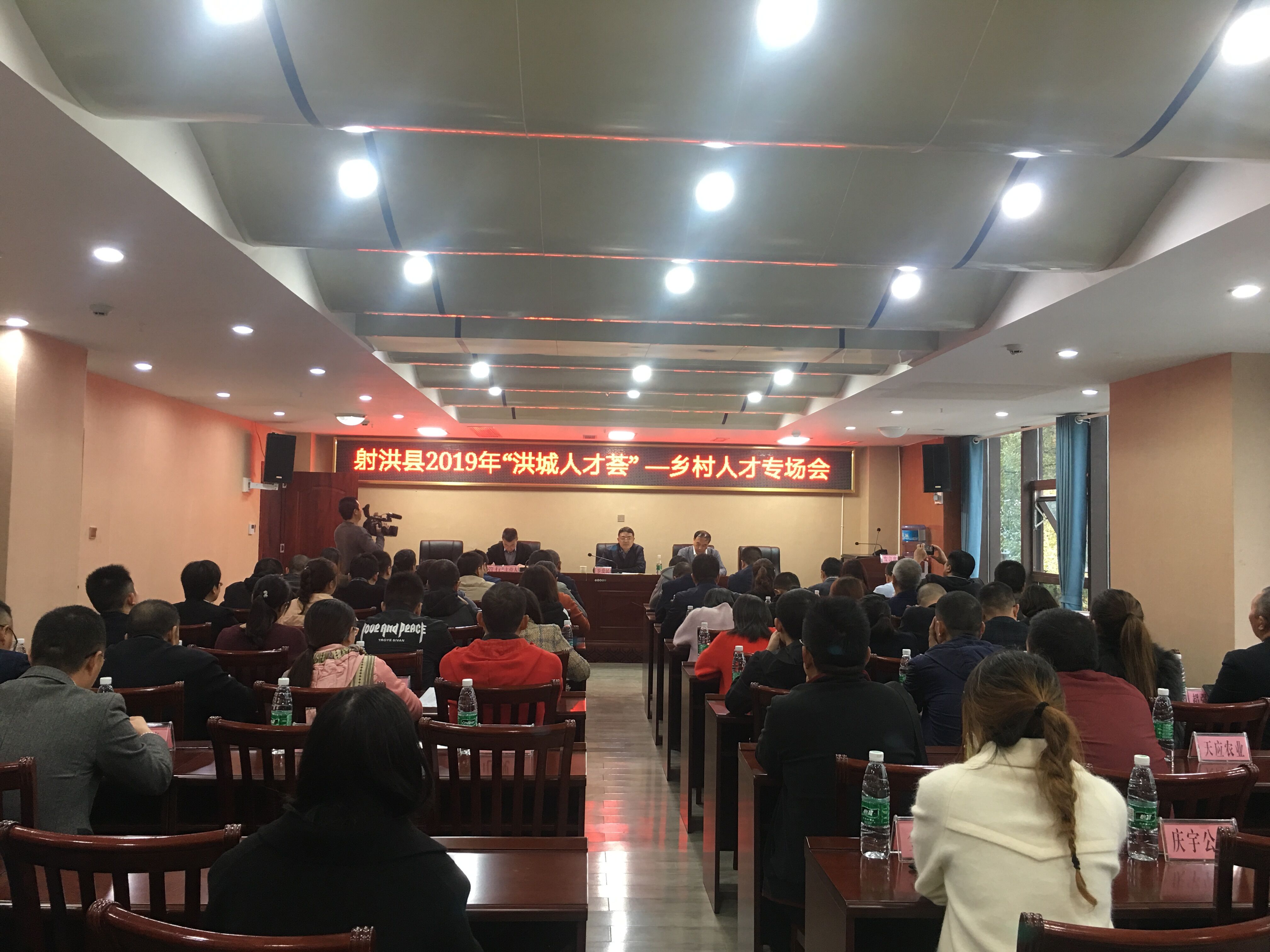 2019年10月22日,射洪县2019年"洪城人才荟"--乡村人才专场会在遂宁国家农业科技园区召开,县人才工作领导小组成员单位、各镇(街道)党(工)委、遂宁国家农业科技园区、县经济开发区相关负责人以及涉农企业共70人参加会议,县委组织部副部长管行主持会议,副县长罗爱民到会作重要讲话。
