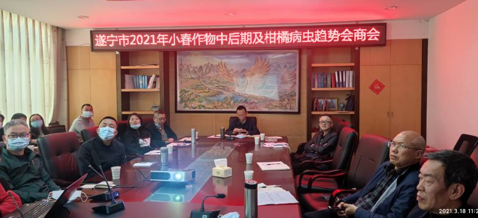 3月18日,遂宁市召开2021年小春作物中后期及柑橘病虫趋势会商暨植保重点工作推进会。市农业农村局党组成员、总农艺师张羽主持会议,各县(市、区)农业农村局分管领导、植保站长、测报人员,市气象、种子、农技、柑橘等相关专家参加了会议。