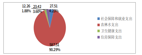 2024年度一般公共预算财政拨款支出650.7万元,主要用于以下方面:一般公共服务支出0万元,占0%;教育支出0万元,占0%;科学技术支出0万元,占0%;文化旅游体育与传媒支出0万元,占0%;社会保障和就业支出27.51万元,占4.23%;卫生健康支出12.26万元,占1.88%;农林水支出587.51万元,占90.29%;住房保障支出23.42万元,占3.6%;(注:仅罗列本部门涉及的全部功能分类科目,至类级)