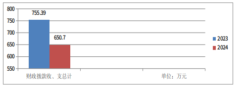 2024年度财政拨款收入、支出总计均为650.7万元。与2023年度相比,财政拨款收入总计、支出总计各减少104.69万元,下降13.86%。主要变动原因是厉行节约,缩减财政开支。