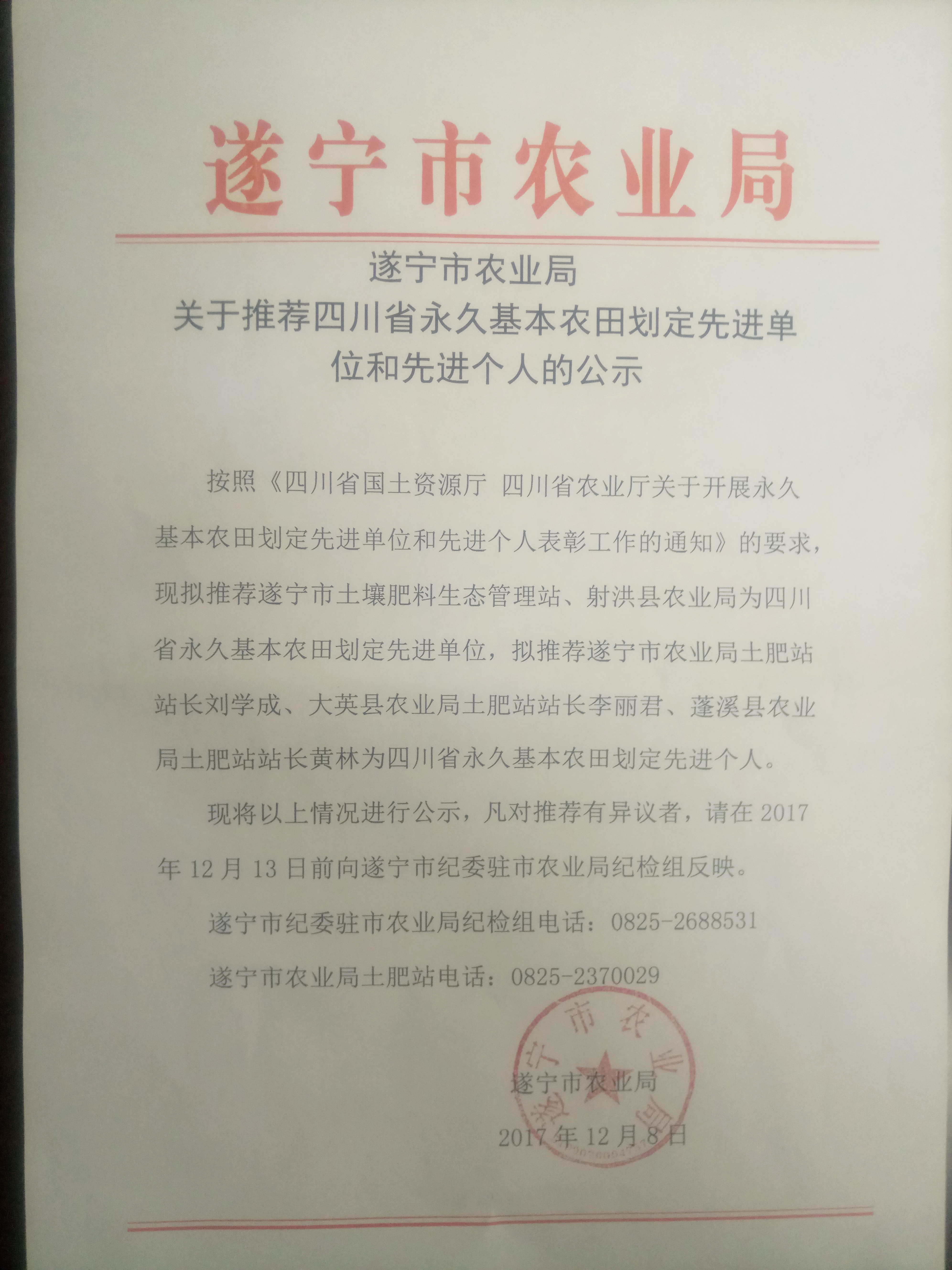 遂宁市农业局关于推荐四川省永久基本农田划定先进单位和先进个人的公示