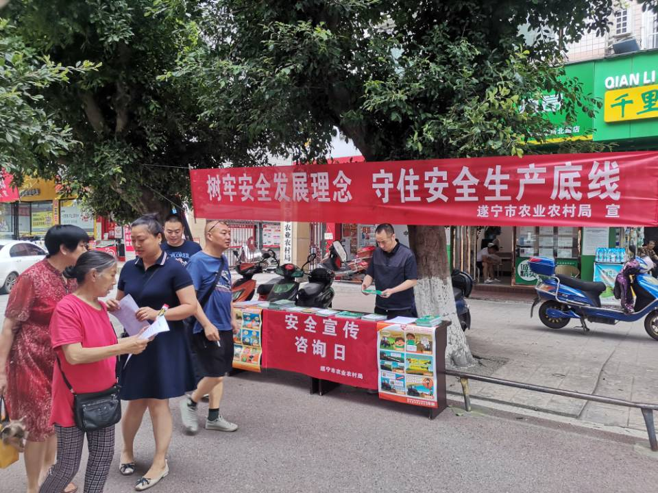 6月16日,遂宁市农业农村局组织开展以“遵守安全生产法、当好第一责任人”为主题的“安全宣传咨询日”活动。重点围绕安全生产十五条措施、畜禽养殖安全、农机安全、农村能源安全等方面开展宣传活动。