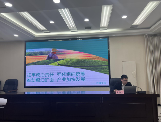 (种植业科科长张启文做“抗牢政治责任、强化组织统筹、推动粮油扩面、产业加快发展”汇报)