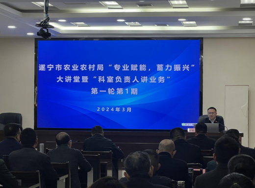 为推进乡村全面振兴不断取得新进展、新成果,努力让农业高质高效、乡村宜居宜业、农民富裕富足的美好图景在遂州大地加速铺陈,遂宁市农业农村局举办“专业赋能,蓄力振兴”大讲堂暨“科室负责人讲业务”系列活动。3月20日下午,第一轮第一期开讲,由市委农办督查科科长王金柱、种植业科科长张启文分别做“青春建功新时代、砥砺奋进正当时”、“扛牢政治责任、强化组织统筹、推动粮油扩面、产业加快发展”业务讲授,课件生动精美,讲授主题突出,既展示了科室重难点业务,又分享了近年来取得的成绩,也分析了当前存在的困难和解决问题的办法和思路,树立了学思践悟、笃行不怠的良好风气。课后,听课领导做现场点评,并进行现场打分。